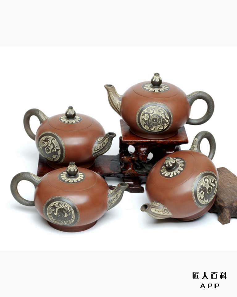 【四神壶组】荣获2015年“百花杯”中国工艺美术精品奖金奖,获外观设计专利。以中国四方神兽—青龙、白虎、朱雀、玄武四大神兽为题材,代表东、西、南、北方位守护神。寓意国泰民安,万物生辉之意,实乃泡茶之吉祥器具。