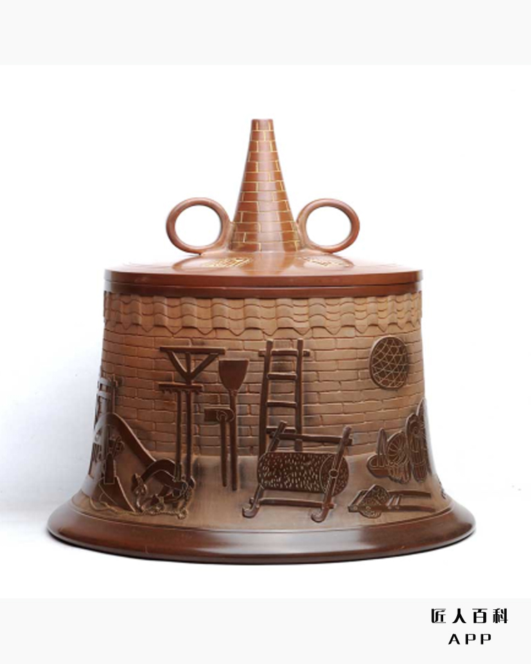 【乡情茶叶罐】这是一款充满农家乡村气息的坭兴陶茶叶罐,作者通过熟悉的农家木犁、铁耙撩、摞谷耙、鱼篓、石磨、水缸等家居物件,描述了一幅农人的生产劳动和生活,反映了丰富的农家生产劳动内容和浓郁的节气风俗,让人勾起浓浓的乡愁和美好回忆。