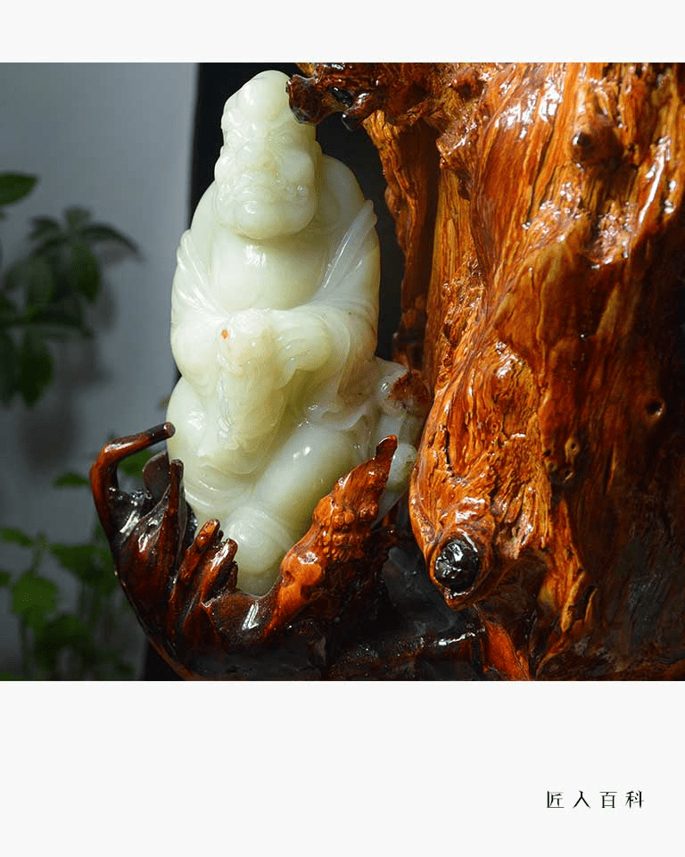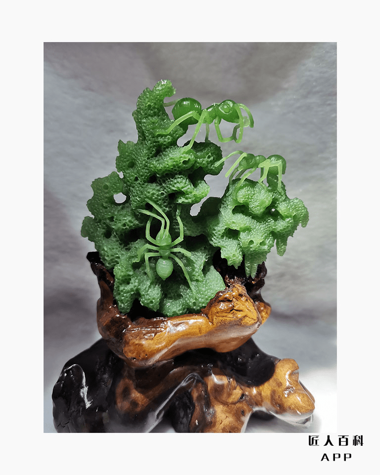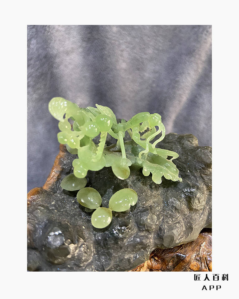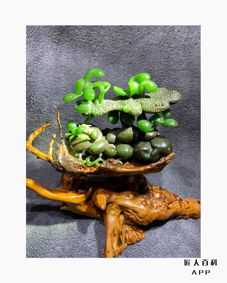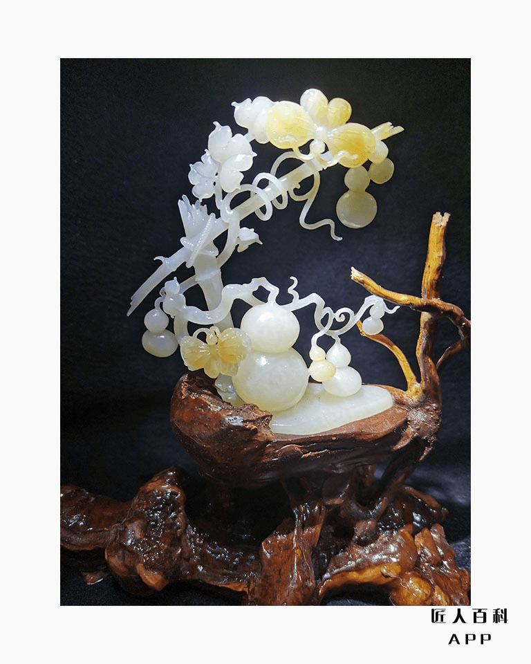 作品《子孙万代》选材精良,设计新颖,雕工细腻流畅,弧面圆润光滑,将传统文化与现代创新相结合,又利用木雕工艺品与玉雕作品完美的融合,给观者一种耳目一新的视觉冲击。葫芦,也称之为“福禄”,被民间认为是吉祥辟邪之物,其藤蔓绵延,籽粒繁多,枝蔓也同“万”谐音,被视为子孙繁茂的吉祥植物。作品利用传统文化中的葫芦为载体,向我们表达出“子孙万代,繁荣昌盛,生生不息……”的美好寓意。值得一提的是,在本作品中,作者灵活的利用俏色巧雕出两只展翅欲飞的蝴蝶,一静一动,妙趣横生,使原本传统意义上的作品更加生动,既完美的展现出玉器秀的品质,也体现出作者的别具匠心和完美的雕刻技艺。